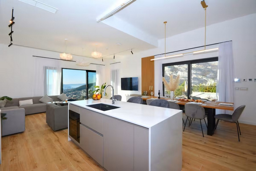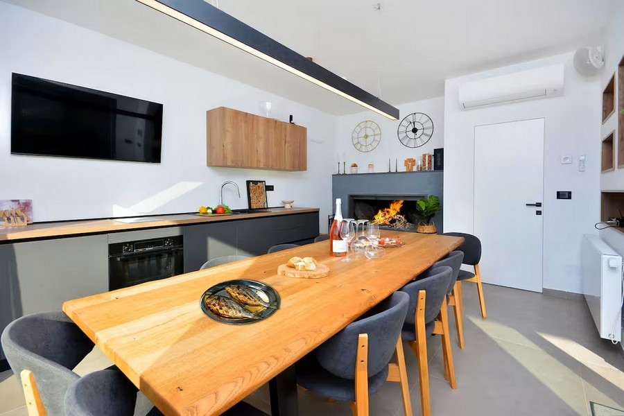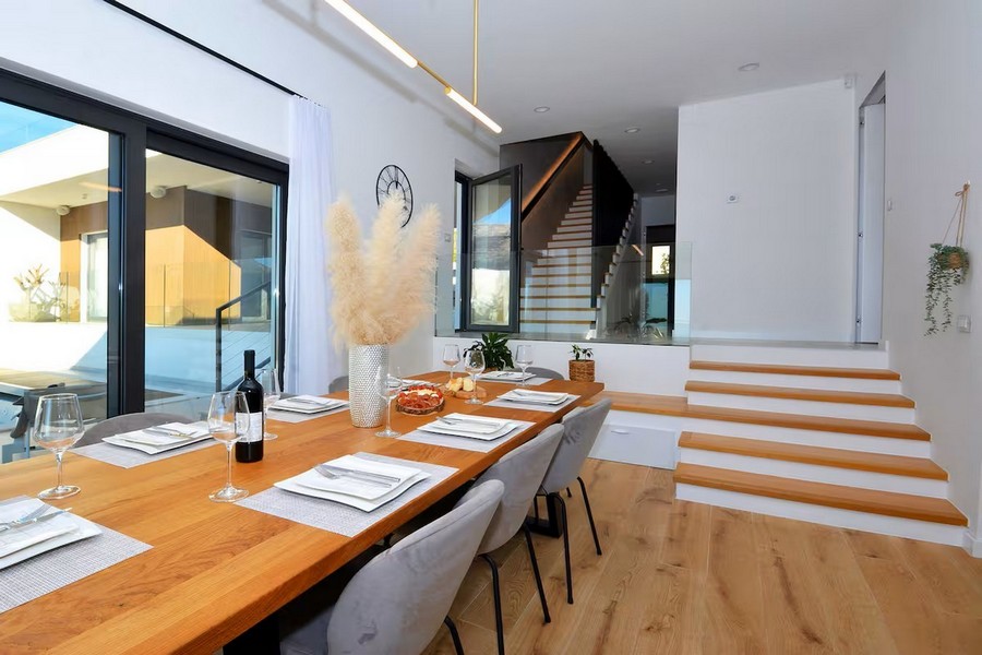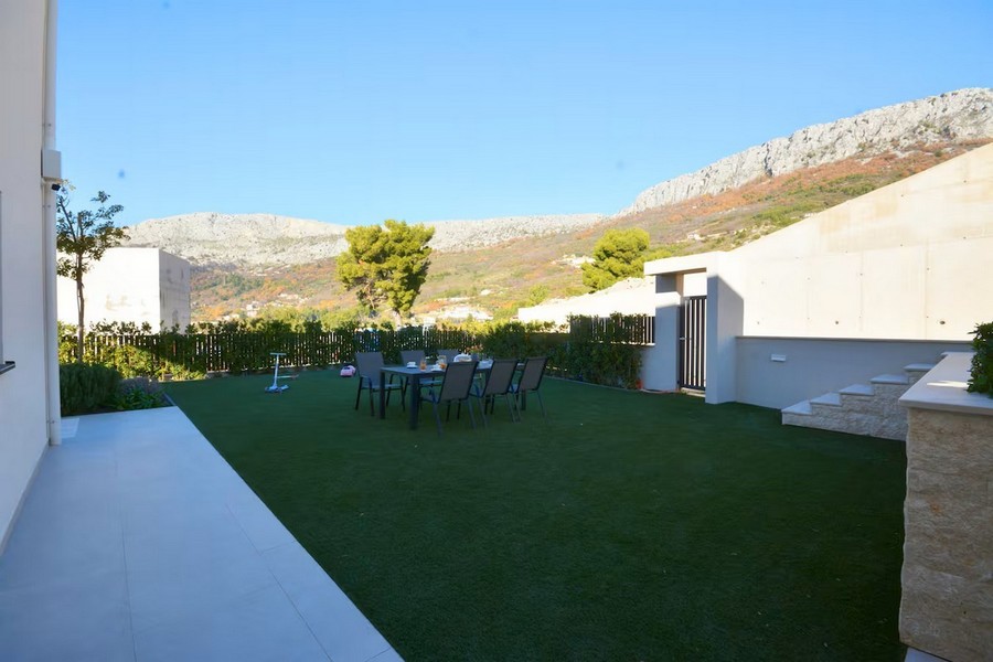 Von allen Terrassen der Villa besteht ein traumhafter Blick. Besonders bei Nacht entsteht eine inspirierende Stimmung beim Blick auf die Lichter von Split. Im Außenbereich der Villa gibt es einen Infinity-Pool mit Sonnenterrasse und Außendusche, eine Sommerküche sowie mehrere Parkplätze.