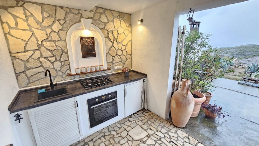 Das Haus bietet einen wunderschönen Blick auf das Meer. Es wird inklusive Möblierung zum Verkauf angeboten. Im Außenbereich gibt es eine Sommerküche.