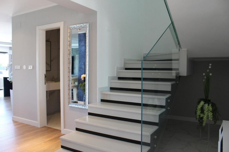 Von der geräumigen Dachterrasse besteht ein wunderschöner Meerblick. Die Villa ist sehr hochwertig ausgestattet und sie verfügt über eine Garage sowie Parkplätze im Außenbereich.