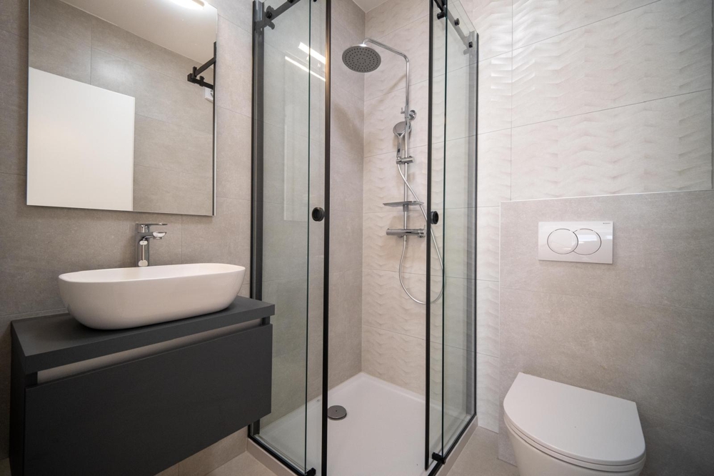 Die Wohnung verfügt über eine Gesamtfläche von 76,15 m² (davon 54,11 Innenbereich und 15,79 m² Terrasse sowie zwei Parkplätzen mit 25 m²) und zwei Schlafzimmer, zwei Badezimmer (eins en-suite), Abstellraum, Wohnzimmer, Küche und Essbereich sowie eine Terrasse mit Meerblick.