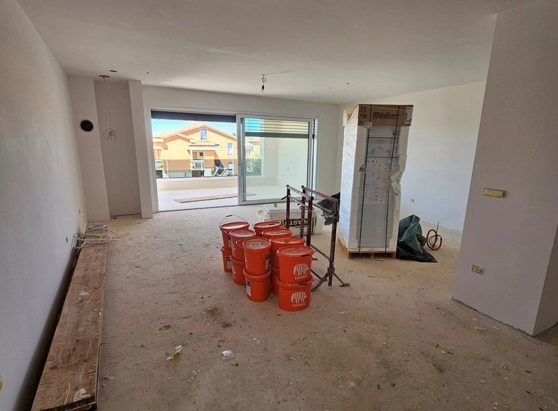 Die Wohnung befindet sich im ersten Obergeschoss eines Neubaus (Fertigstellung geplant bis Ende 2025) und sie bietet eine Gesamtfläche von ca. 110 m² mit drei Schlafzimmern, zwei Badezimmern, Wohnzimmer mit Küche und Essbereich sowie eine ca. 28 m² große und überdachte Terrasse.
