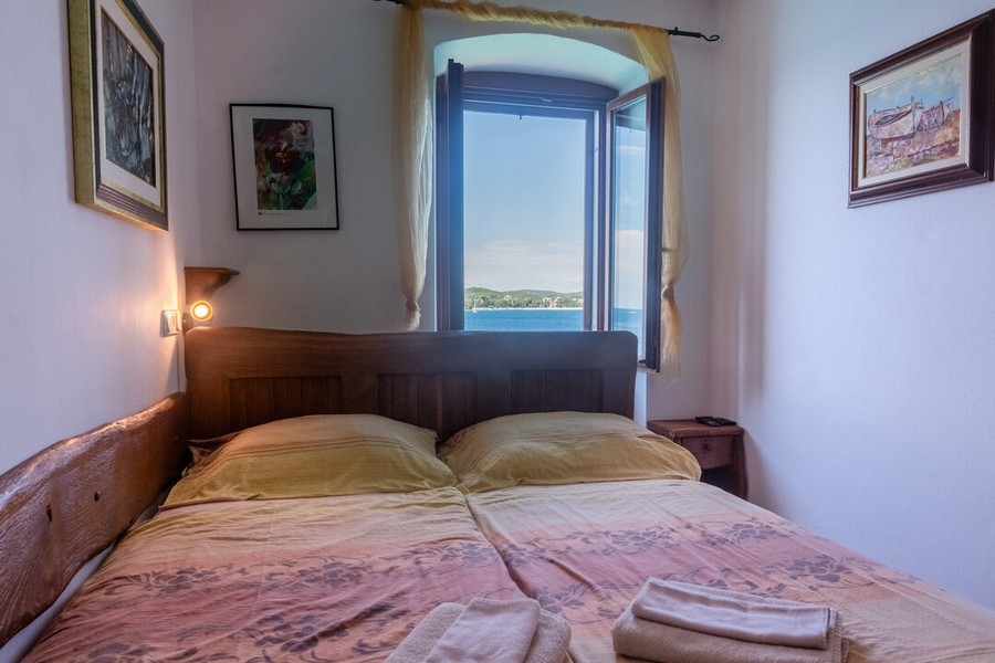 Vom einem der Schlafzimmer besteht ein spektakulärer Meerblick. Von Küche und dem anderen Schlafzimmer besteht ein netter Blick in die Gassen von Rovinj. Die Wohnung wird inklusive Möblierung zum Verkauf angeboten.